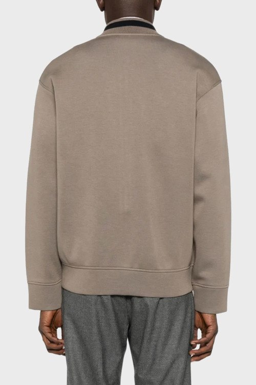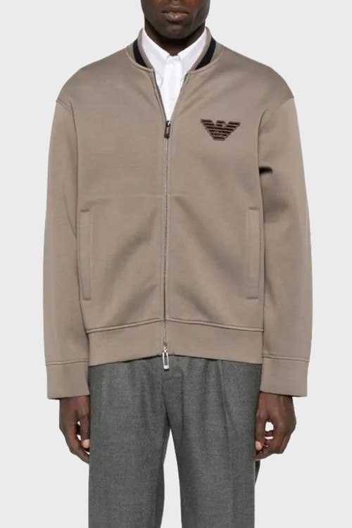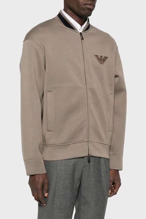 Детали: Мужской бежевый бомбер из модала от Emporio Armani (Эмпорио Армани). Эластичная резинка на воротнике, манжетах, застежка на молнию, прорезные карманы, патч-лого на груди