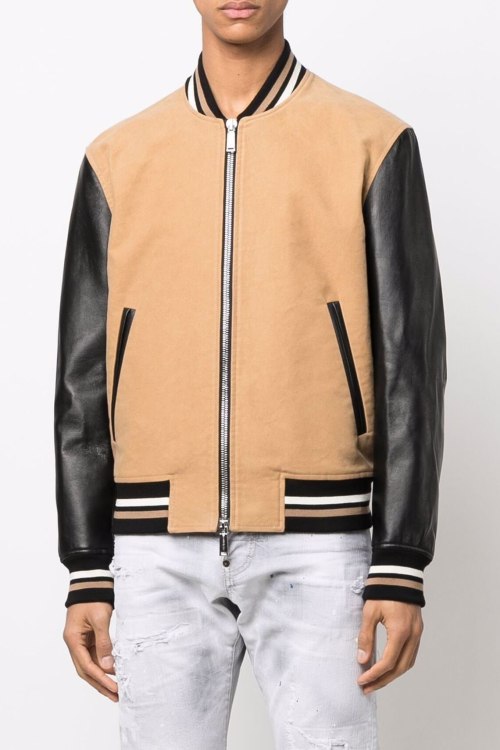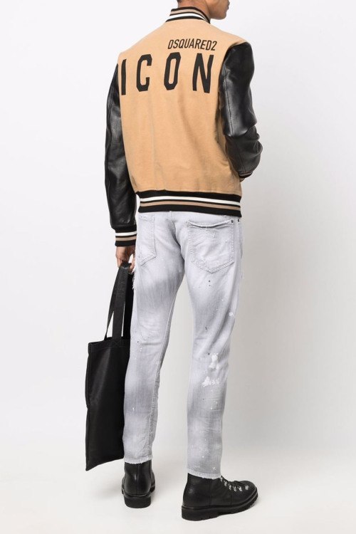 Мужская бежевая куртка-бомбер из хлопка и натуральной кожи от Dsquared2 (Дискваред). Комбинированный дизайн, трикотажная резинка на воротнике, манжетах и по низу изделия, длинные рукава из натуральной кожи, принт с логотипом бренда и фирменной надписью Icon