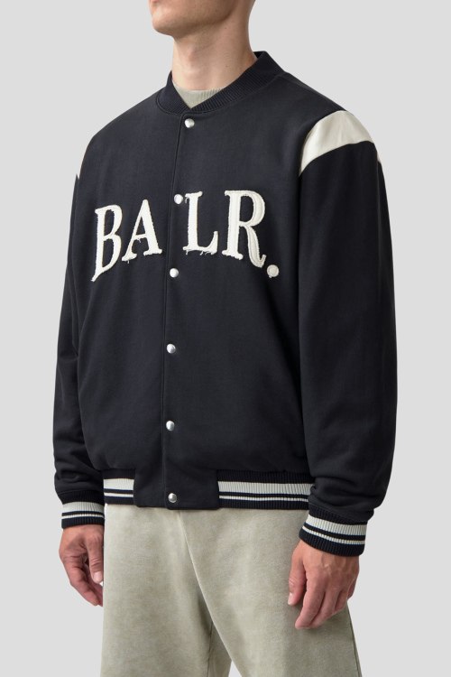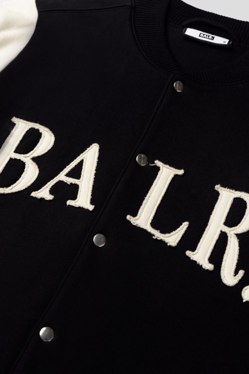 Детали: Мужской черный хлопковый бомбер Urban Bomber от Balr. (Барл.). Нашивка с логотипом, воротник-стойка, боковые карманы, застежка на кнопки, классическая длина, трикотажные манжеты и нижний край