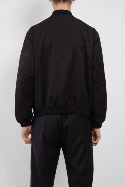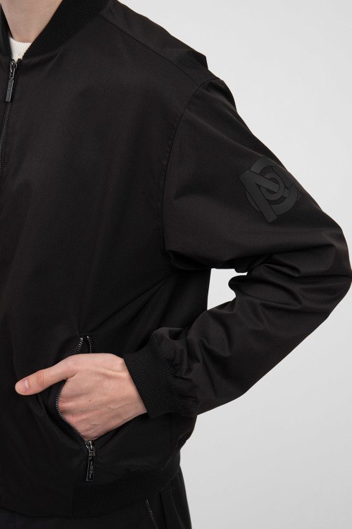 Мужская черная куртка-бомбер из полиэстера от Costume National (Костюм Националь). Классическая длина, застежка на молнию, длинные рукава, трикотажная резинка на воротнике, манжетах и по низу изделия, прорезные карманы на молнии, логотип бренда.