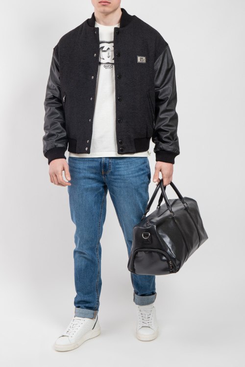 Мужская черная куртка-бомбер из шерсти от Dolce & Gabbana (Дольче энд Габбана). Классическая длина, застежка на кнопки, рукава из натуральной кожи, трикотажная резинка на манжетах и по низу изделия, прорезные карманы на молнии, патч-лого на груди.
