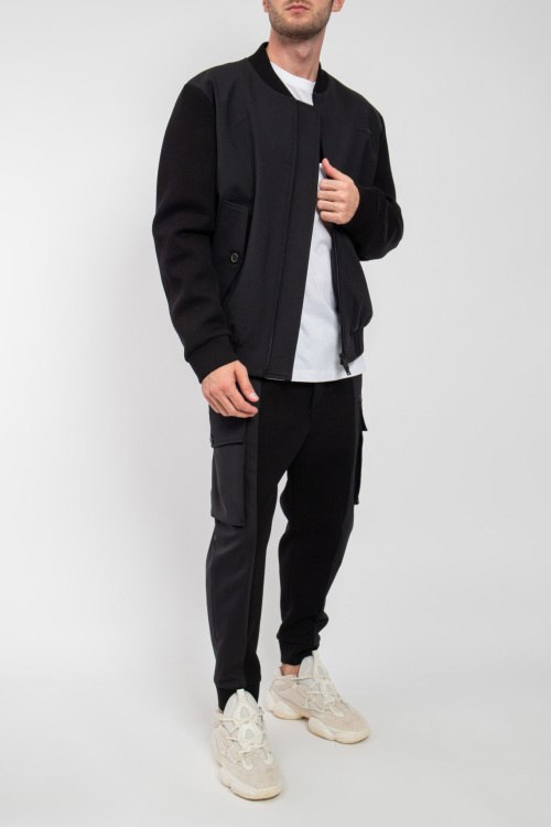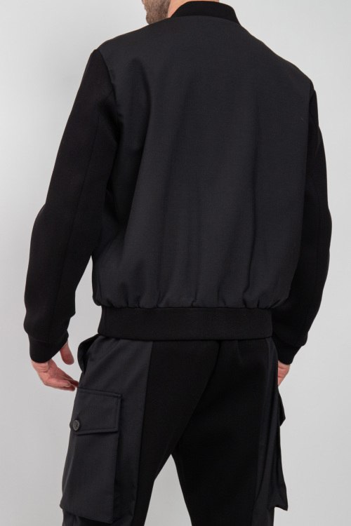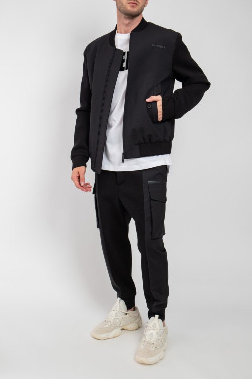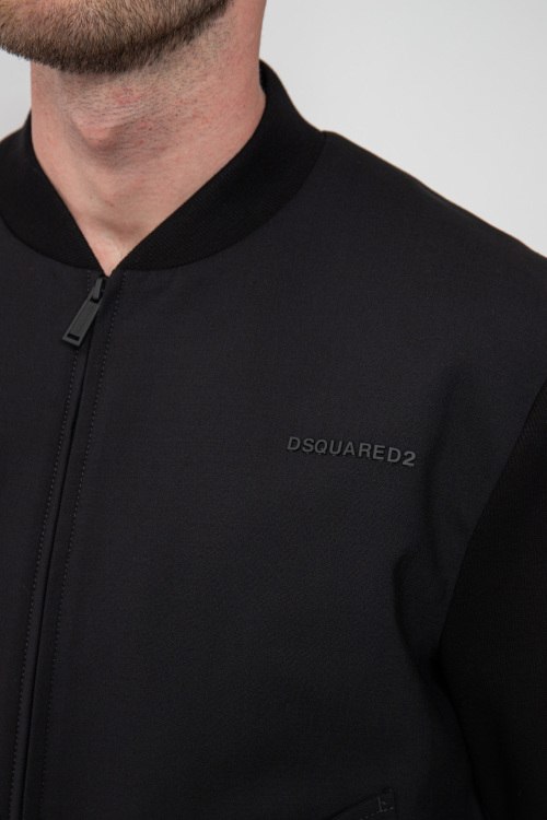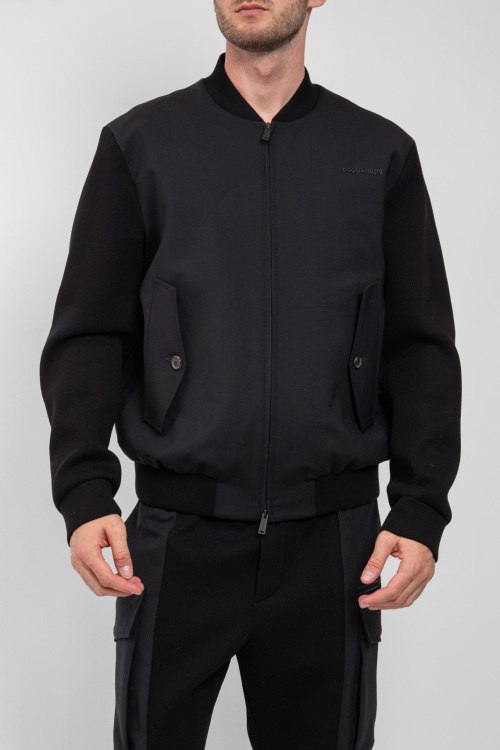 Мужская черная куртка-бомбер из шерстяного микса от Dsquared2 (Дискваред). Классическая длина, застежка на молнию, комбинация материалов, прорезные карманы с клапаном, трикотажная резинка на манжетах и по низу изделия, фактурный логотип бренда на груди.