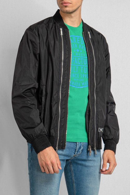 Мужская черная куртка-бомбер из полиамида от Dsquared2 (Дискваред). Классическая длина, воротник стойка, эластичные манжеты на рукавах и по нижнему краю, два прорезных кармана, застежка-молния, декор в виде двух дополнительных молний вдоль основной застежки, патч-лого. Полуобхват груди: 60 см, полуобхват талии: 56 см, ширина плечей: 51 см, длина изделия по среднему шву спинки от горловины: 69 см, длина рукава: 67 см.