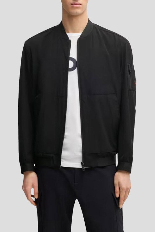 Детали: Мужская черная куртка-бомбер Oneth из полиамида и эластана от Hugo Boss (Хуго Босс). Застежка на молнию, трикотажная резинка на манжетах и по низу изделия, накладные карманы, дополнительный карман на рукаве, патч-лого