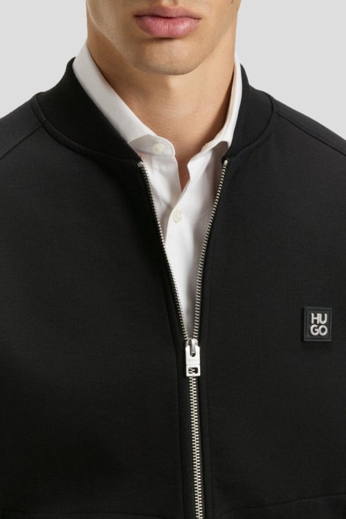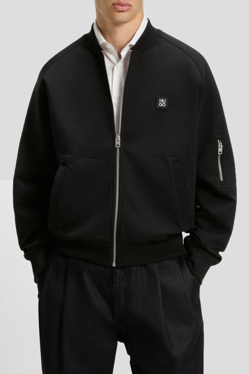 Детали: Мужской черный хлопковый бомбер Dargenzip от Hugo by Hugo Boss (Хуго бай Хуго Босс). Логотип на груди, воротник-стойка, боковые карманы, карман на рукаве, застежка-молния, классическая длина, трикотажные манжеты и нижний край