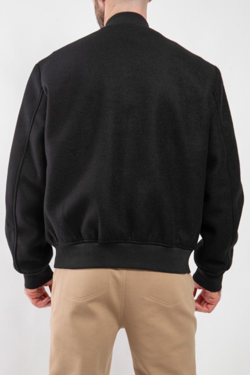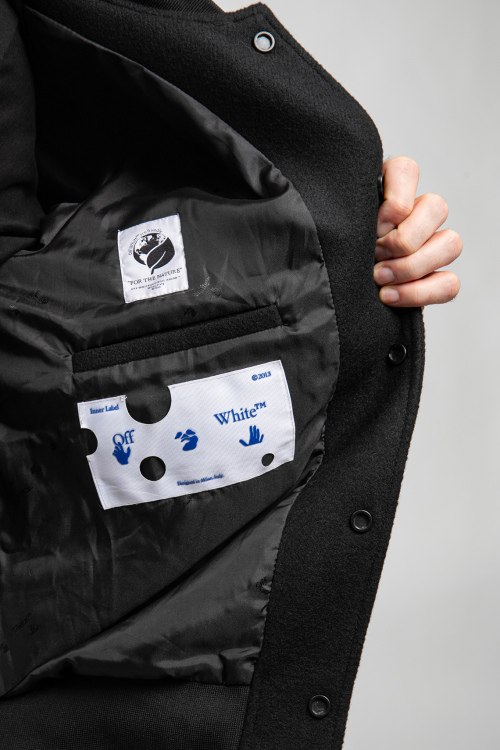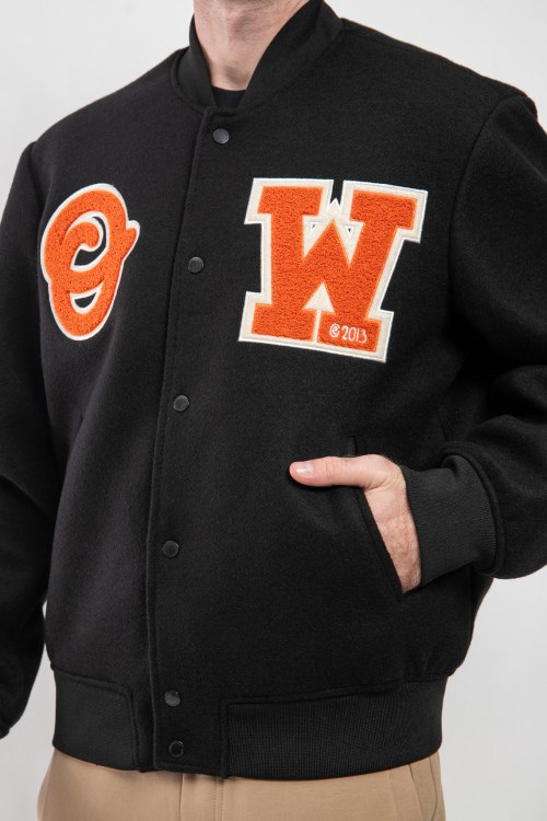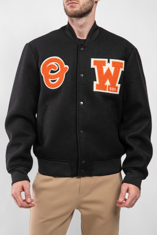Детали: Мужской черный шерстяной бомбер от Off-White (Офф-Вайт). Оранжевые нашивки на груди, трикотажный воротник-стойка, боковые карманы, застежка на кнопки, классическая длина, трикотажные манжеты и нижний край