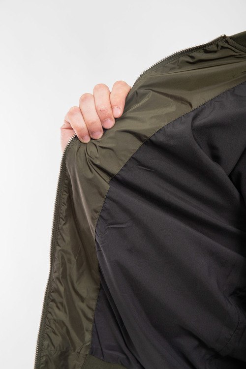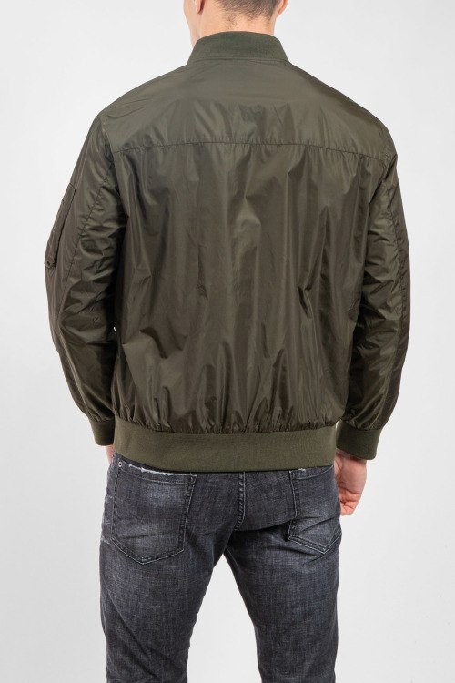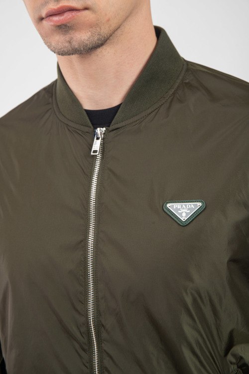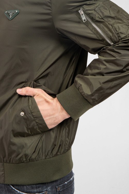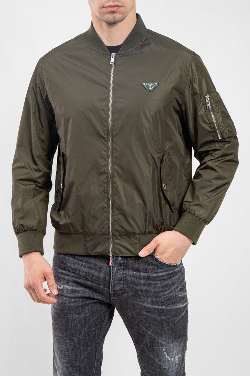 Мужской бомбер цвета хаки из полиэстера от Prada (Прада). классическая длина, застежка на молнию, трикотажная резинка на манжетах и по низу изделия, патч-лого на груди, прорезные карманы с клапаном на кнопке. Замеры для размера на фото: 50; длина - 62 см; ПОГ - 54 см; ПОТ - 52 см; ПОБ - 48 см; длина по внутреннему шву рукава - 45 см; ширина рукава - 21 см.
