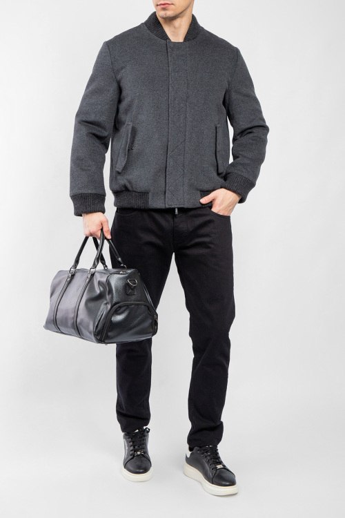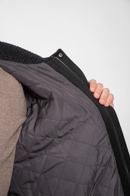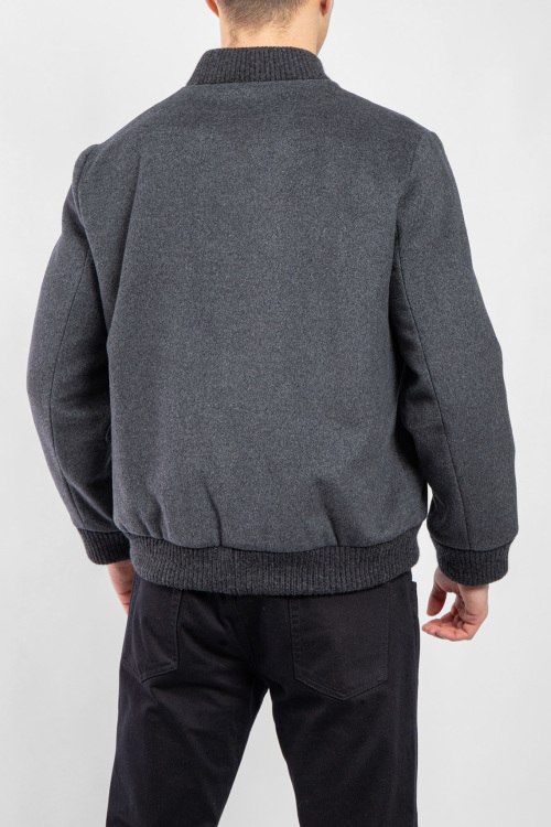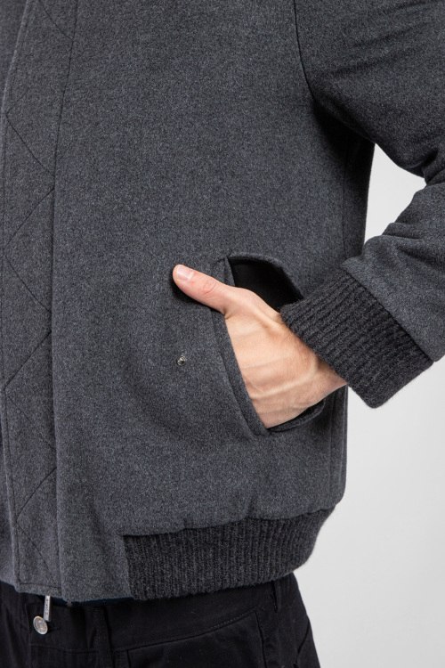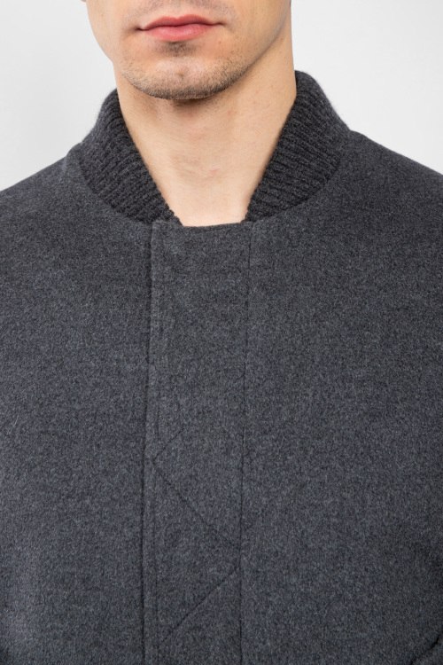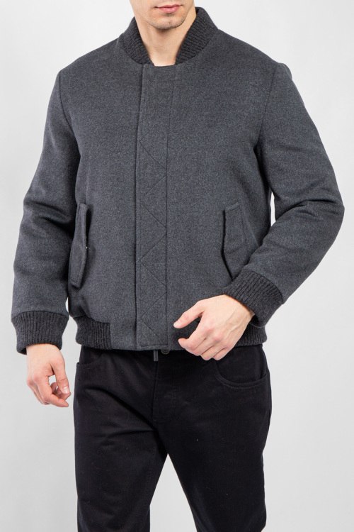 Мужской серый бомбер из шерсти и кашемира от Diego M (Диего М). Воротник-стойка, боковые карманы на кнопке, застежка на молнию и кнопки, классическая длина, вязаные манжеты и нижний край.
