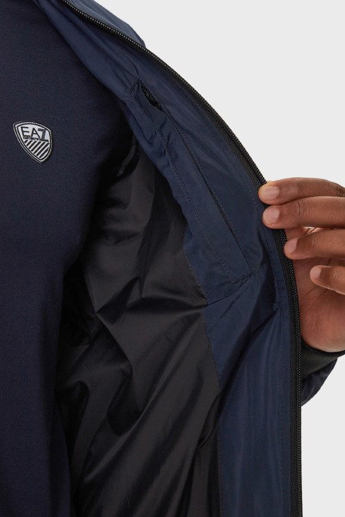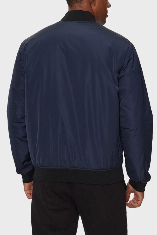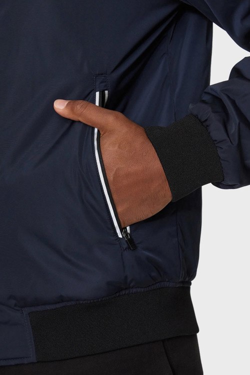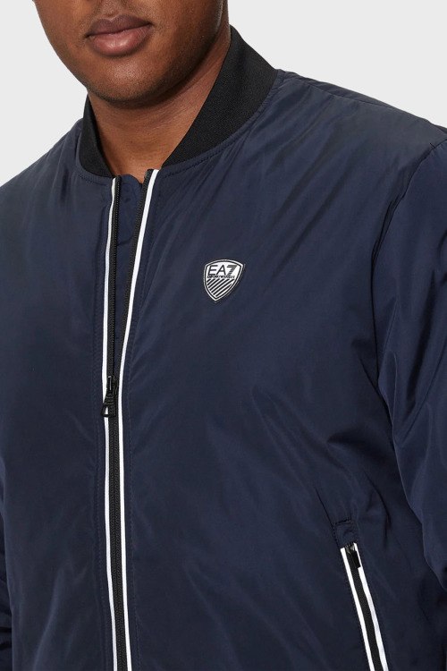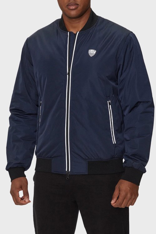 Детали: Мужской темно-синий бомбер от EA7 Emporio Armani (ЕА7 Эмпорио Армани). Воротник-стойка, логотип на груди, боковые карманы на молнии, застежка-молния, классическая длина, трикотажные манжеты и нижний край