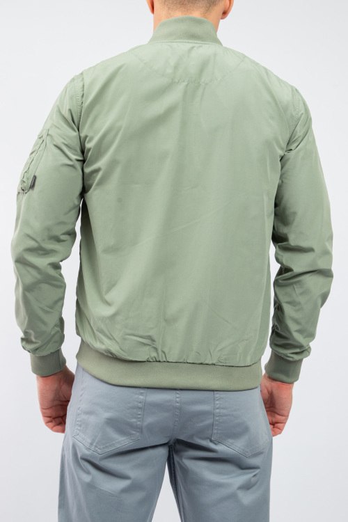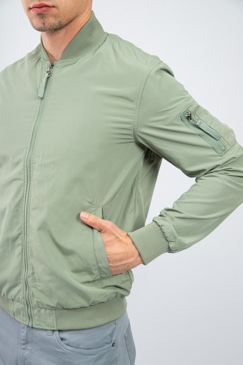 Детали: Мужской светло-зеленый бомбер из полиэстера от Jack & Jones (Джек энд Джонс). Воротник-стойка, боковые карманы, карман на рукаве, застежка-молния, классическая длина, трикотажные манжеты и нижний край