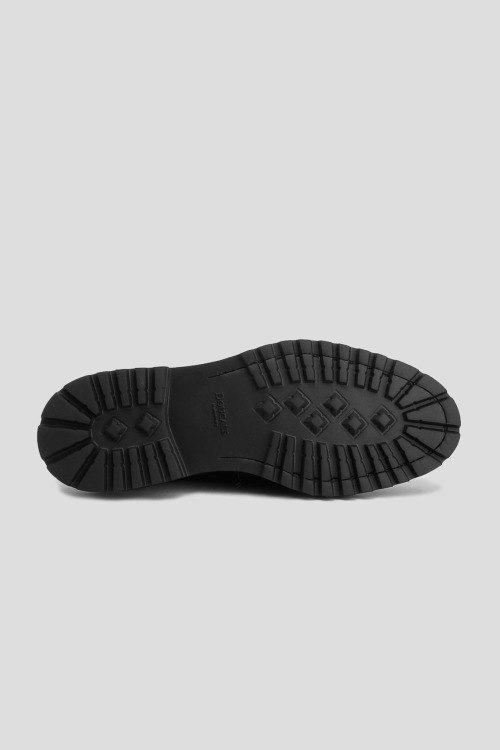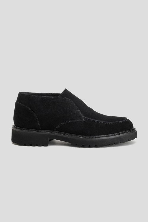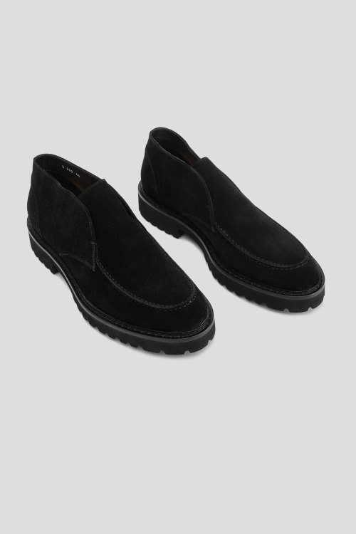 Детали: Мужские черные замшевые дезерты от Doucal's (Дукалс). Модель без застежки, тональная строчка, закругленный носок, подошва в тон изделия