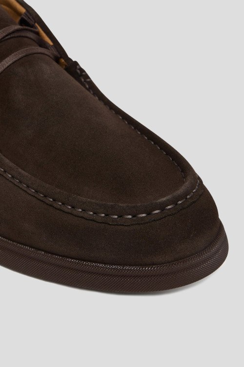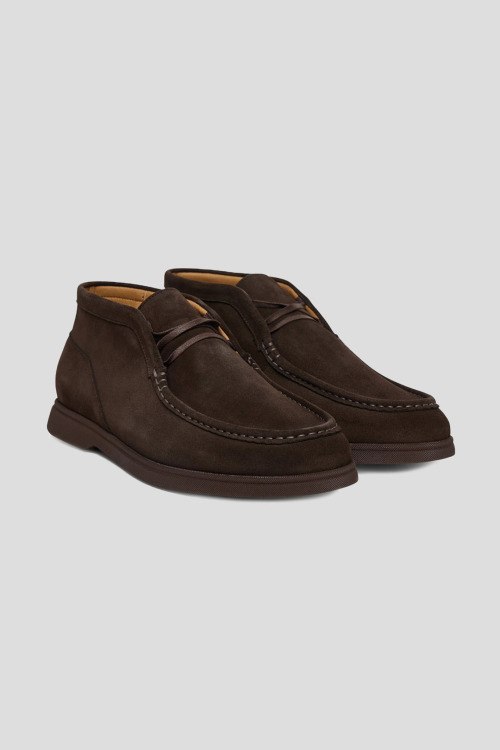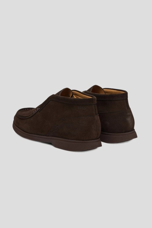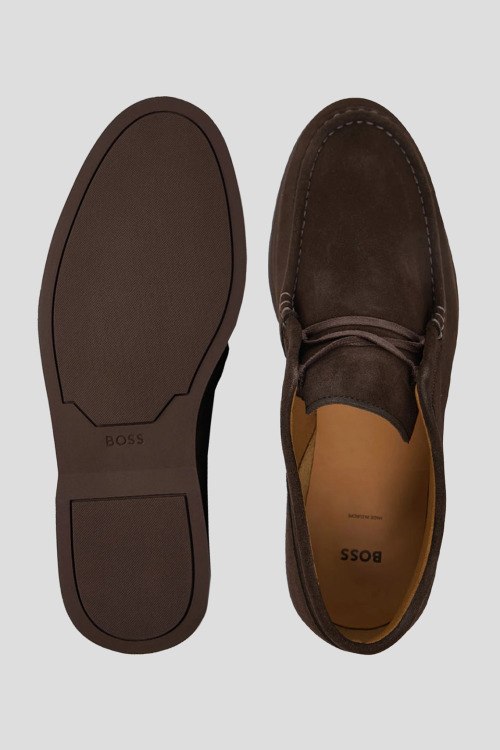 Детали: Мужские темно-коричневые замшевые дезерты Sienne от Hugo Boss (Хуго Босс). Короткая модель, открытая шнуровка, миндалевидный носок