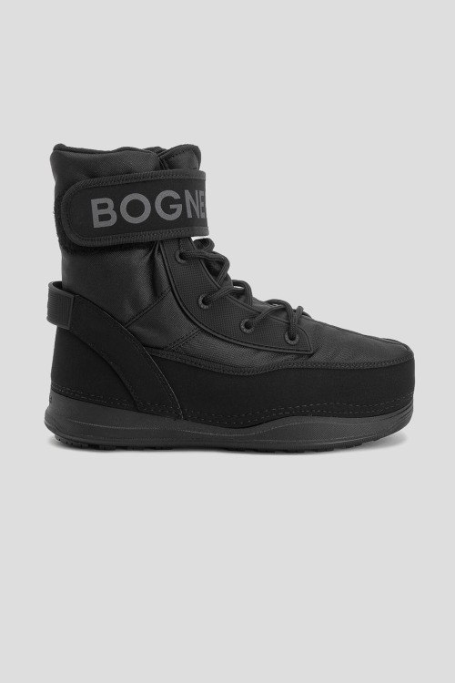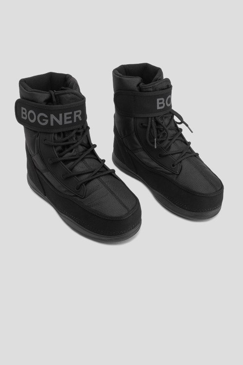 Детали: Мужские черные мунбуты из замши и текстиля Laax от Bogner (Богнер). Застежка на липучку с логотипом, классическая шнуровка, закругленный носок, внутри на меху