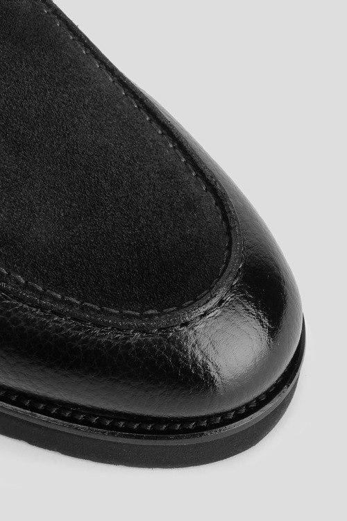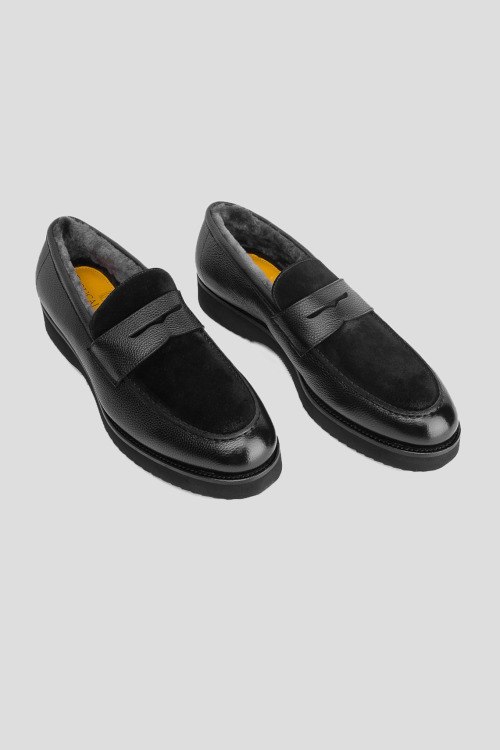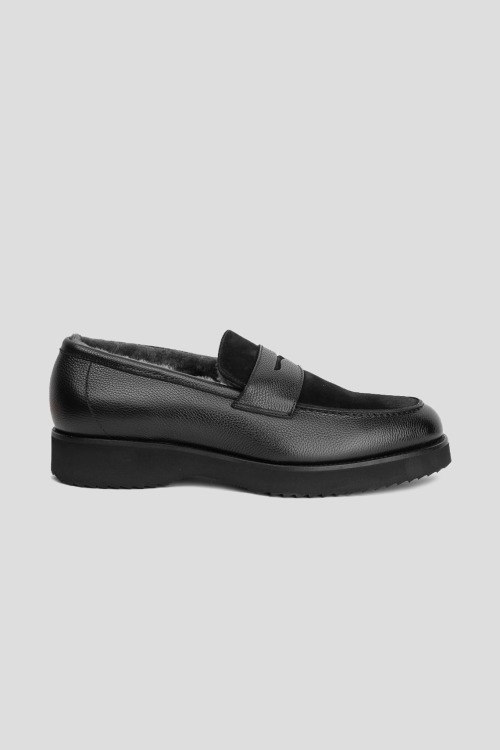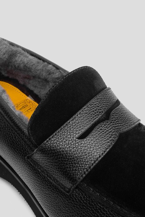Детали: Мужские черные лоферы из кожи и замши от Doucal's (Дукалс). Миндалевидный носок, комбинация материалов, утепленная модель на меху, кожаная стелька с логотипом бренда