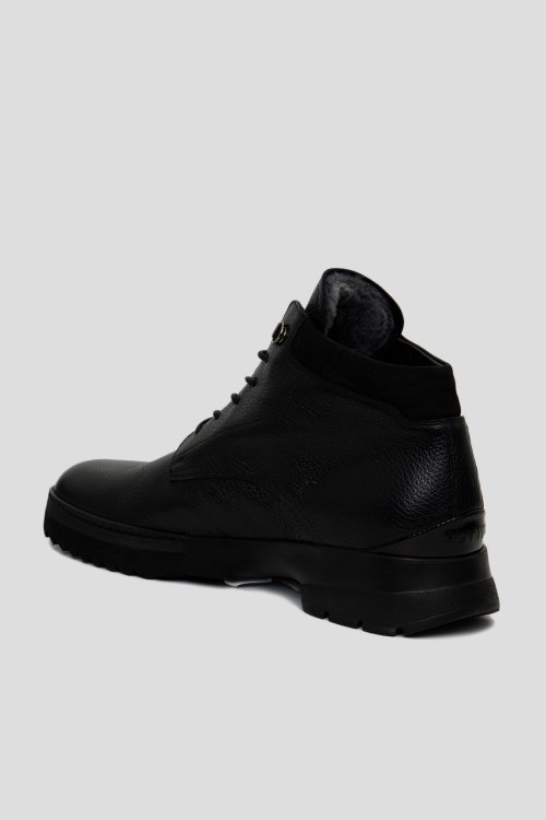 Детали: Мужские черные ботинки из кожи от Gianfranco Butteri (Джанфранко Буттери). Миндалевидный носок, спереди классическая шнуровка, рельефная подошва, модель утепленная натуральным мехом, фирменный логотип бренда