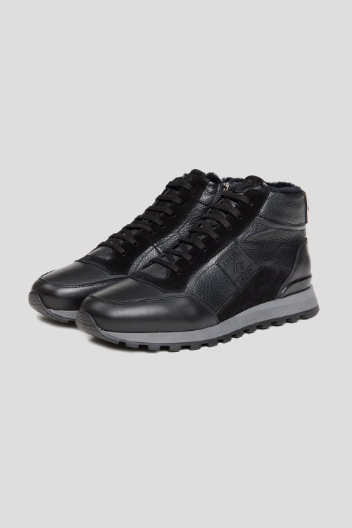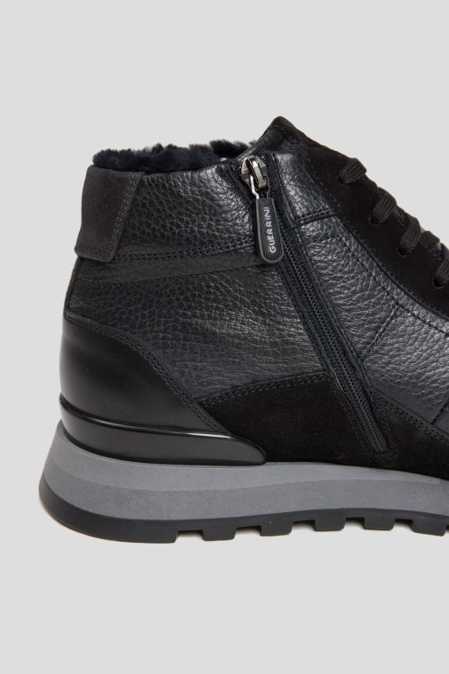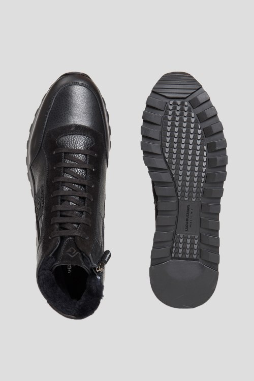 Детали: Мужские черные кожаные ботинки на меху от Luca Guerrini (Лука Гуерини). Модель из зернистой кожи, замшевые вставки, классическая шнуровка, застежка-молния сбоку, закругленный носок, серая подошва