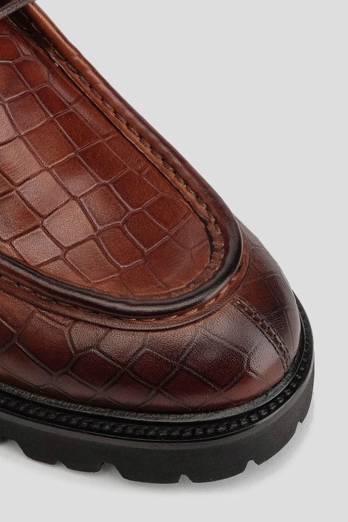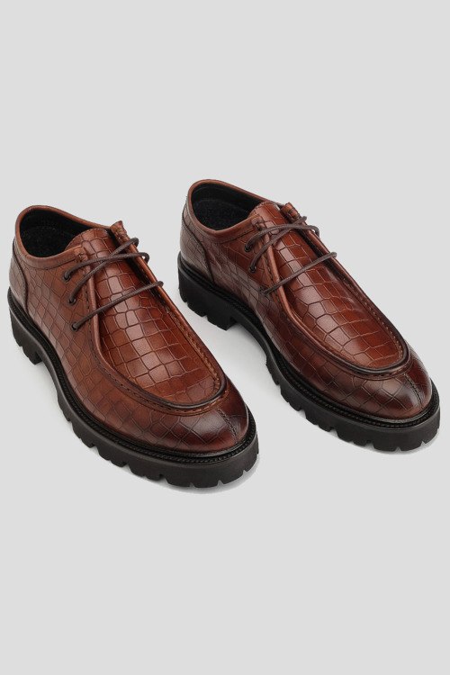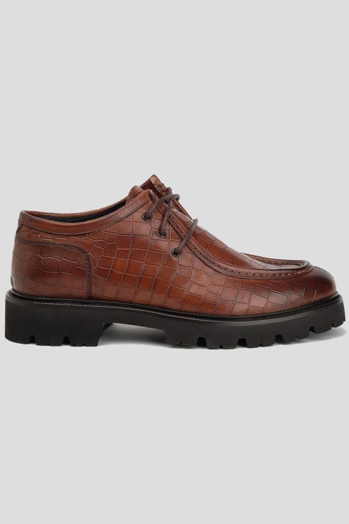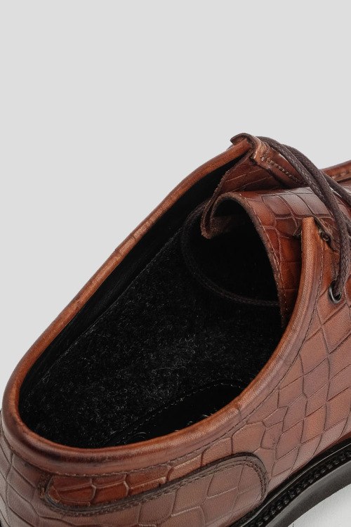 Детали: Мужские коричневые кожаные дезерты на флисе от Brecos (Брекоз). Модель из гладкой кожи, тиснение под кожу крокодила, классическая шнуровка, закругленный носок, тракторная подошва, внутри на флисе