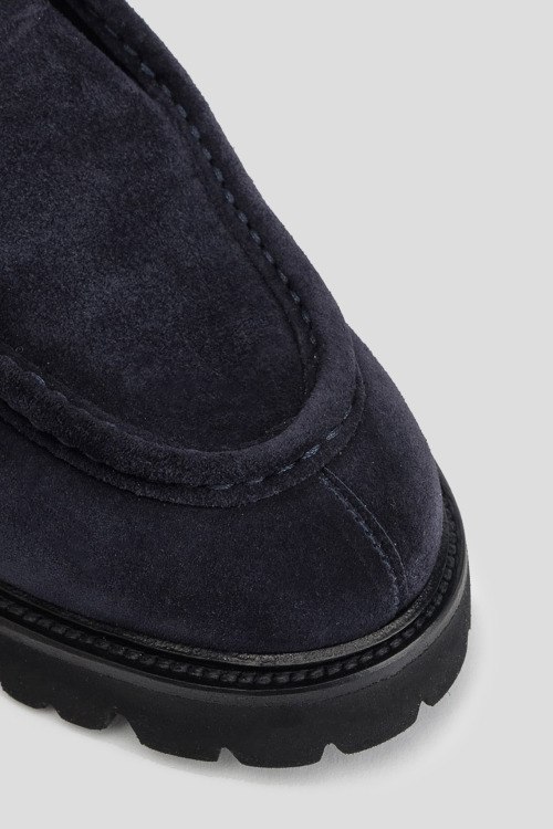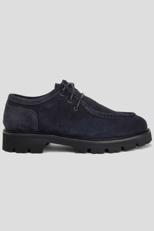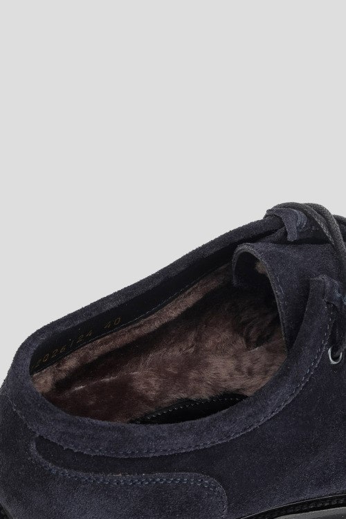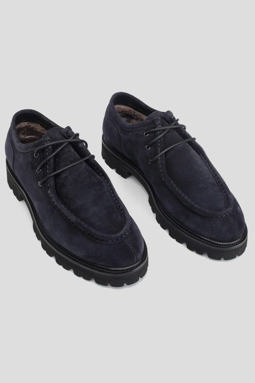 Детали: Мужские темно-синие замшевые туфли на меху от Brecos (Брекоз). Классическая шнуровка, закругленный носок, тракторная подошва, внутри на меху