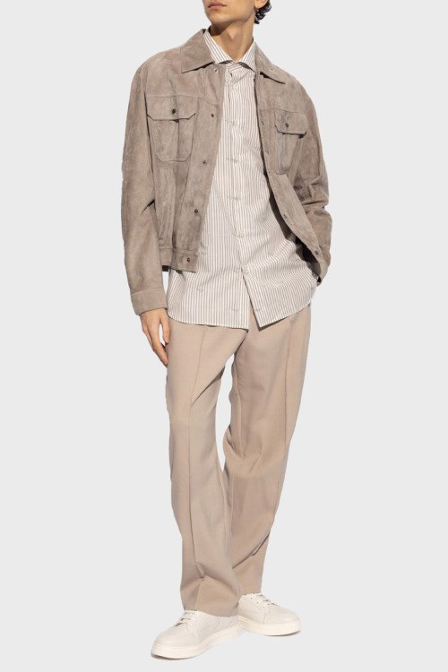 Детали: Мужские бежевые брюки из шерстяного микса от Emporio Armani (Эмпорио Армани). Классическая длина, высокая посадка, застежка на молнию и пуговицу, прорезные карманы, петли в поясе для ремня