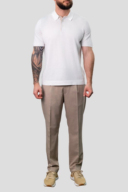 Детали: Мужские бежевые шерстяные брюки от Gran Sasso (Гран Сассо). Дизайн со стрелками, боковые и задние карманы, пояс с петлями для ремня и на завязках, сзади пояс на резинке, полная длина