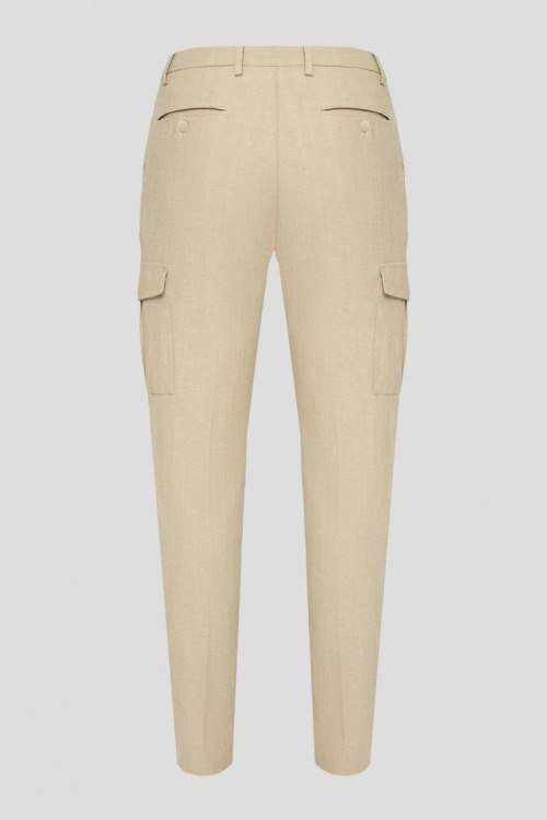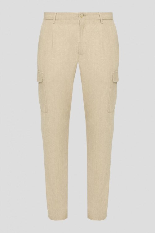 Детали: Мужские песочные брюки-карго из хлопка и льна от Hackett (Хаккетт). Боковые и задние карманы, накладные карманы-карго, пояс с петлями для ремня, зауженный фасон, полная длина