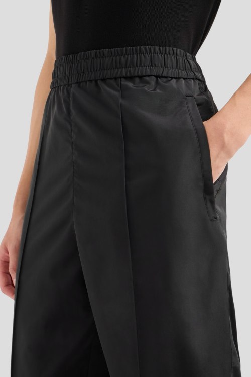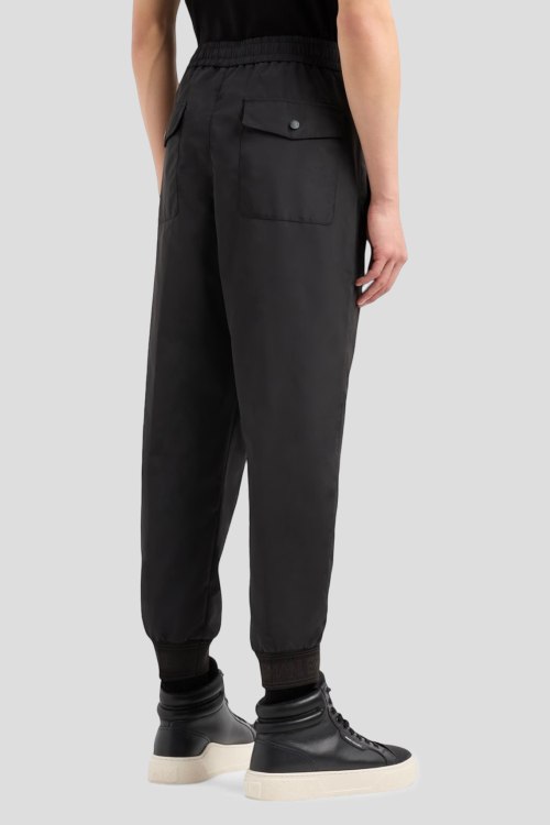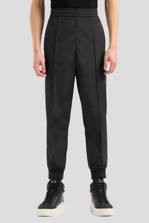 Детали: Мужские черные брюки из полиэстера от Armani Exchange (Армани Эксчендж). Зуженная модель, эластичная резинка на поясе и манжетах, прорезные карманы, накладные карманы с клапаном сзади