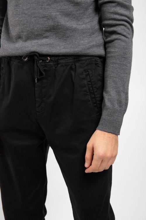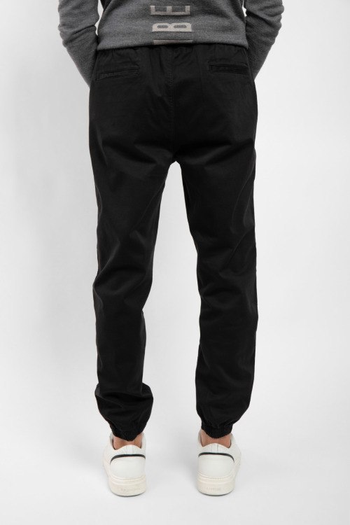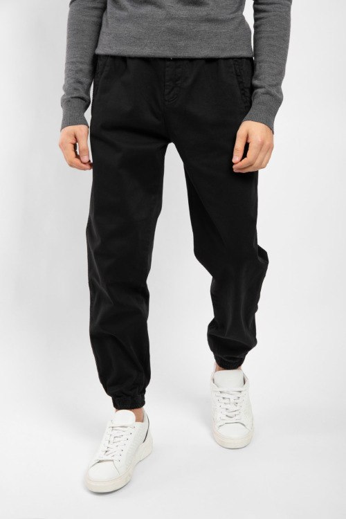 Мужские черные джоггеры из хлопкового микса от Bikkembergs (Биккембергс). Классическая длина, эластичная резинка на манжетах, застежка на пуговицу и молнию, кулиска в поясе, прорезные карманы, зауженная модель.