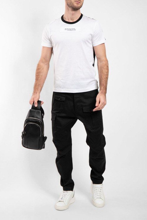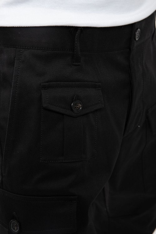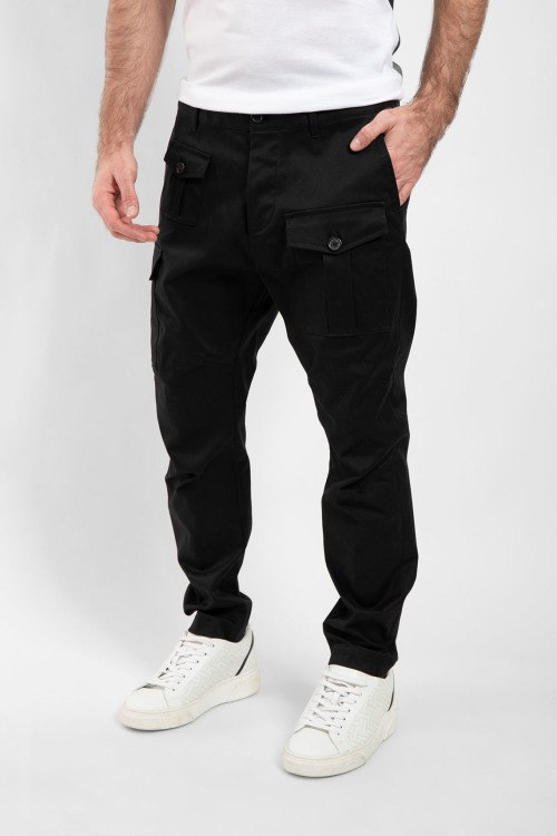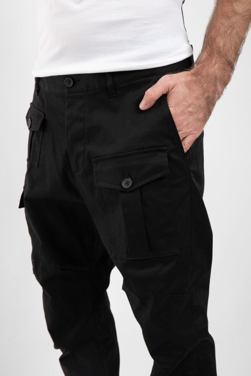 Мужские черные хлопковые брюки-карго от Dsquared2 (Дискваред). Пояс с петлями для ремня, боковые и задние карманы, накладные карманы-карго, нашивка с логотипом сзади, полная длина.