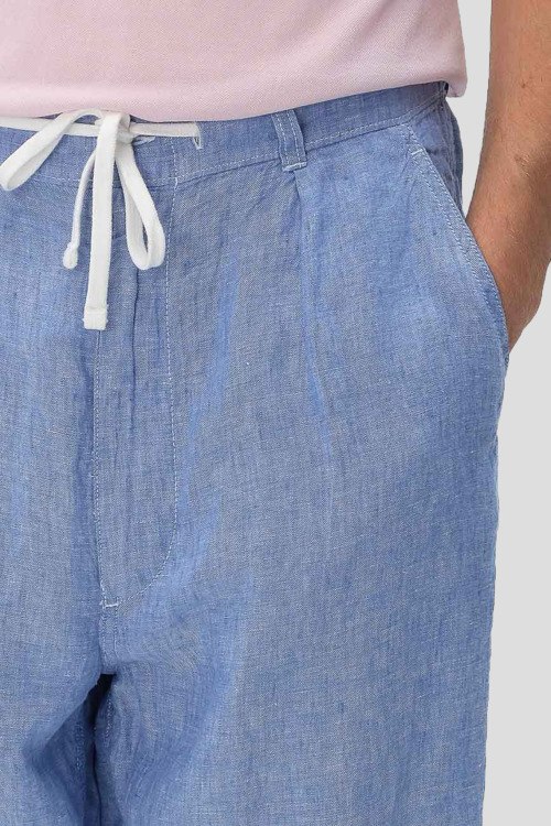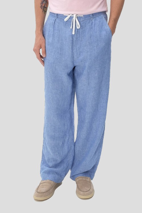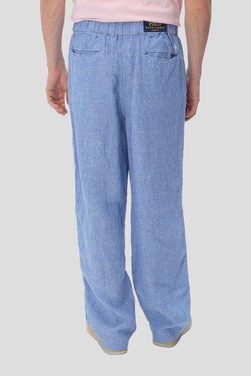 Детали: Мужские голубые льняные брюки от Polo Ralph Lauren (Поло Ральф Лорен). В поясе на завязках и с петлями для ремня, боковые и задние карманы, широкий крой, полная длина