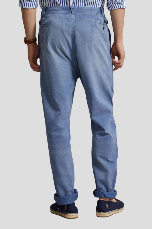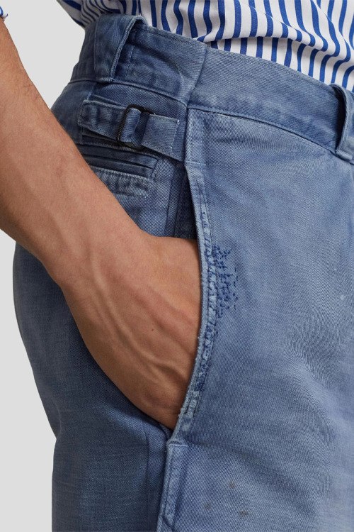 Детали: Мужские голубые хлопковые брюки от Polo Ralph Lauren (Поло Ральф Лорен). Дизайн с потертостями и разбрызганной краской, боковые и задние карманы, пояс с петлями для ремня, полная длина