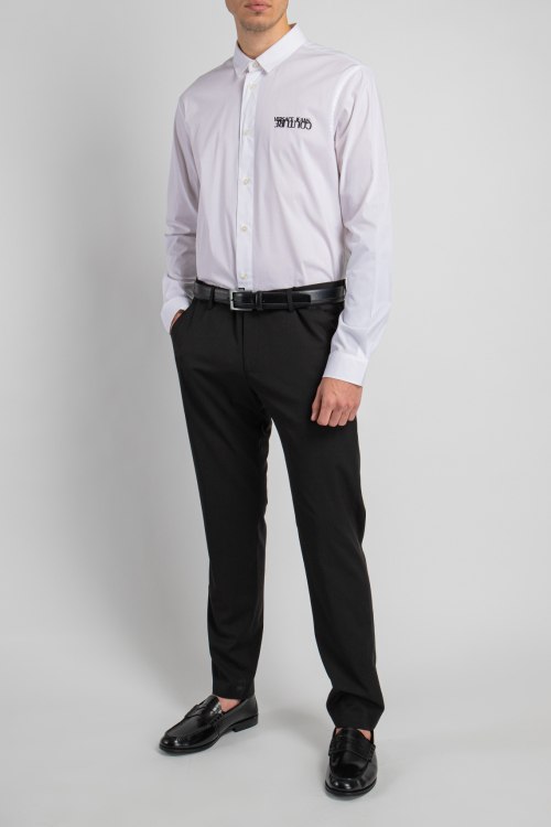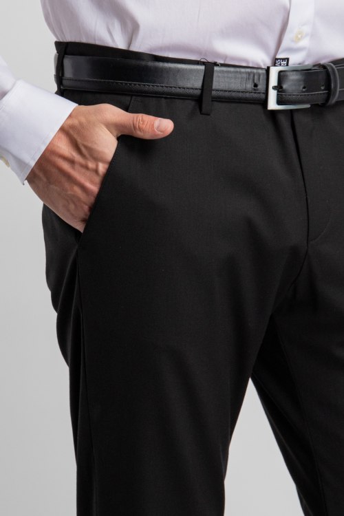 Мужские черные брюки из шерстяного микса от Frankie Morello (Франки Морелло). Классическая модель, полная длина, застежка на молнию и пуговицу, петли в поясе для ремня, четыре кармана. металлическая нашивка с логотипом бренда.