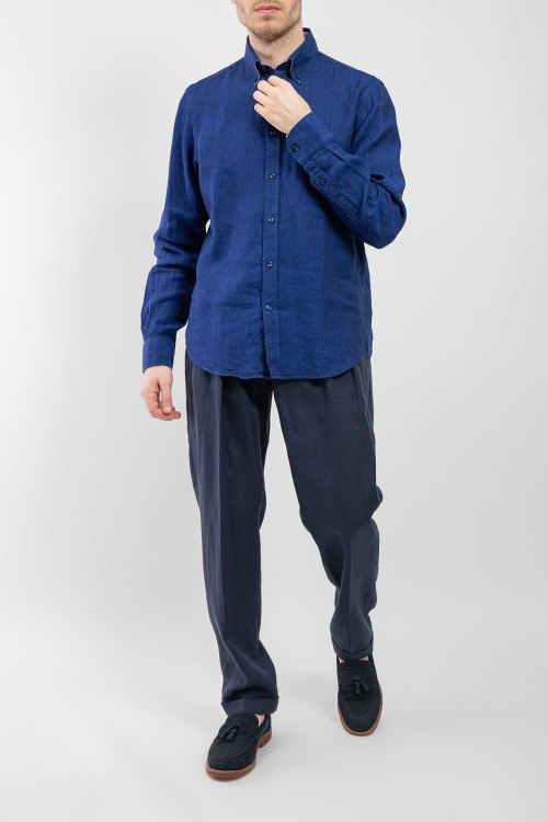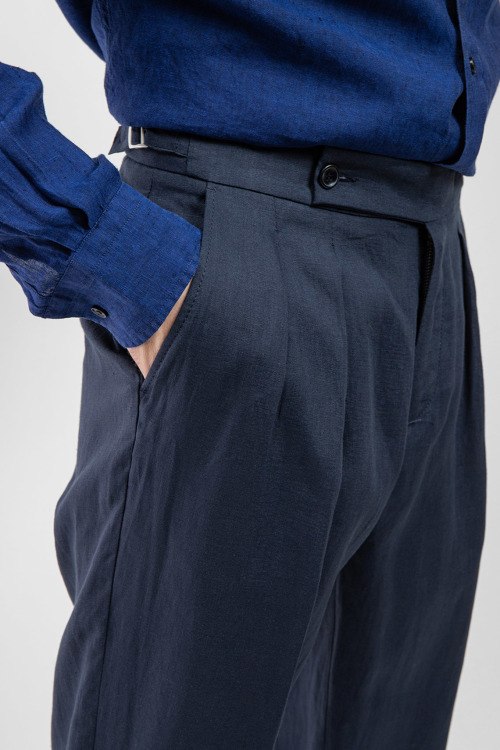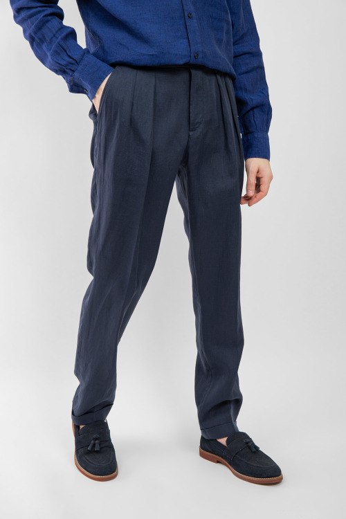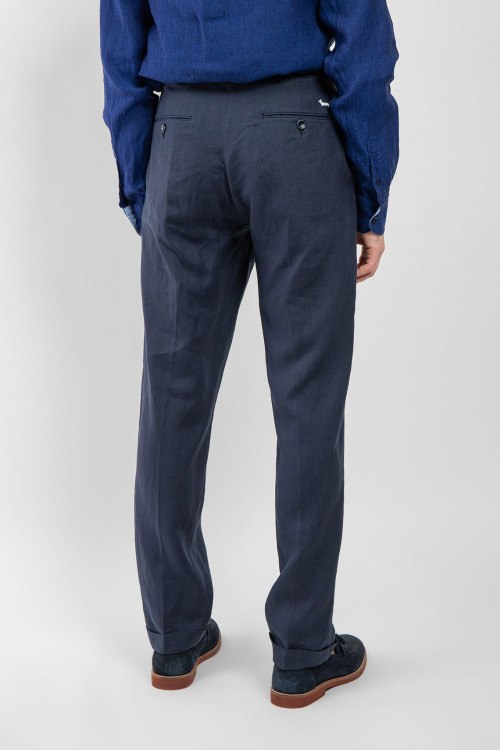 Мужские темно-синие льняные брюки от Harmont & Blaine (Хармонт энд Блейн). Дизайн со складками, боковые и задние карманы, застежка на молнию и пуговицу, полная длина.