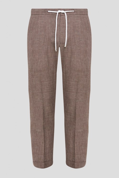 Детали: Мужские коричневые брюки из льна и шерсти от Barba Napoli (Барба Наполи). Дизайн со стрелками, боковые и задние карманы, в поясе на завязках. Обхват пояса: для размера 50 - 82 см, обхват бедер: для размера 50 - 104 см, длина штанины: для размера 50 - 99 см, длина по шаговому шву: для размера 50 - 78 см