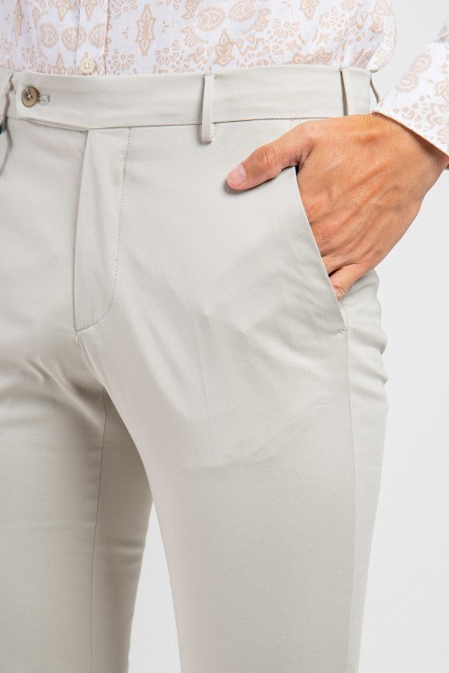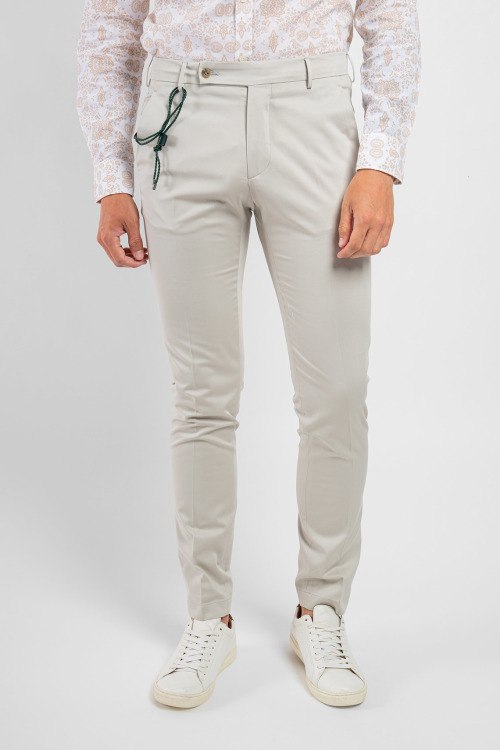 Мужские светло-серые брюки из хлопка от Berwich (Бервич). Застегиваются на пуговицу и скрытую молнию, шлевки для ремня на поясе, два прорезных кармана по бокам, два прорезных кармана сзади изделия, декорированы плетенным, съемным ремешком сбоку.