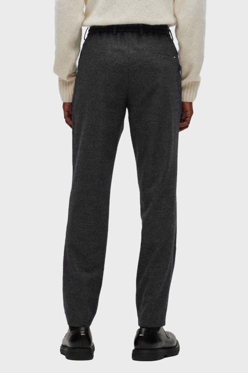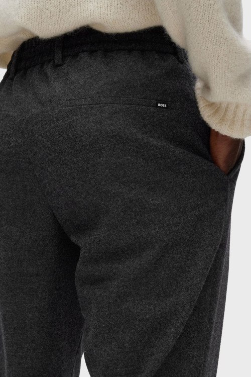 Детали: Мужские темно-серые брюки из натуральной шерсти от Hugo Boss (Хуго Босс). Классическая длина, высокая посадка, эластичная резинка на поясе с кулиской, застежка на молнию и пуговицу, петли в поясе для ремня, прорезные боковые карманы