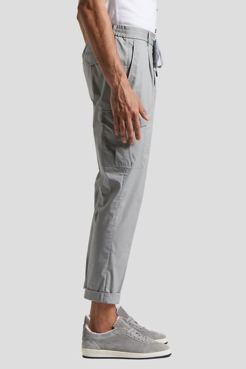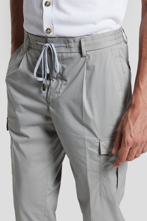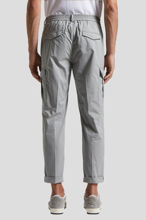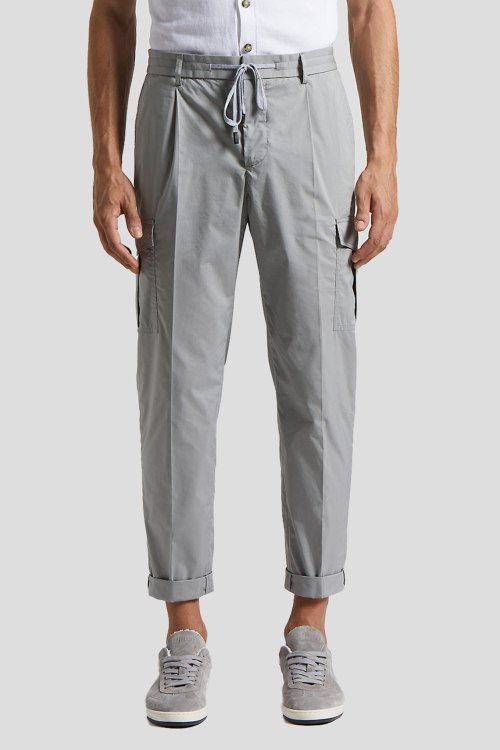 Детали: Мужские серые брюки-карго из хлопкового микса от Peserico (Пезерико). Эластичная резинка в поясе с кулиской, застежка на пуговицу и молнию, прорезные карманы, боковые карманы с клапаном