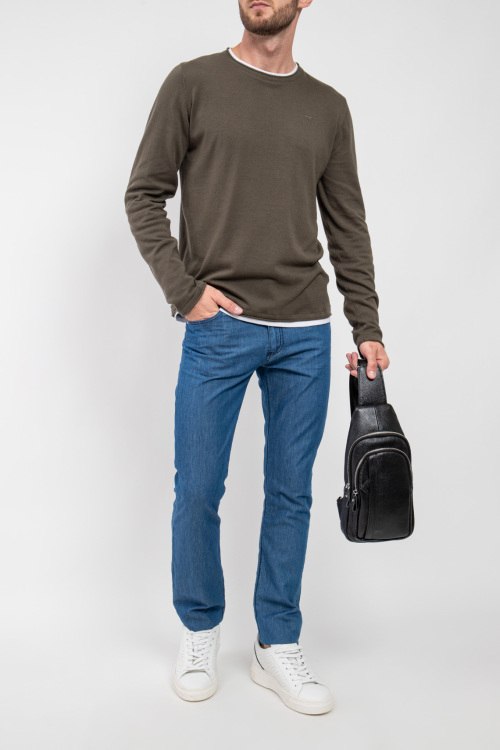 Мужские синие хлопковые брюки от Bernese (Бэрнизе Милано). Пяти-карманная модель, пояс с петлями для ремня, нашивка с логотипом сзади на поясе, полная длина.