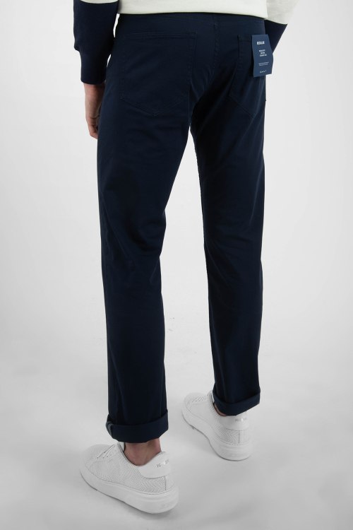Темно-синие хлопковые брюки. Зауженный крой, пятикарманная модель, петли для ремня, нашивка с брендовым логотипом сзади на поясе