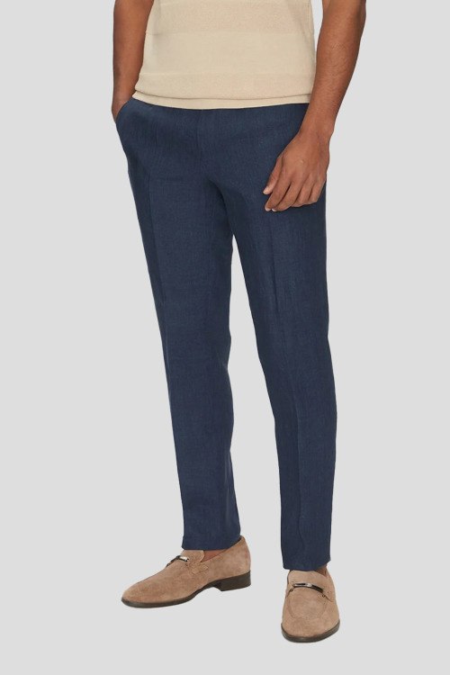 Мужские темно-синие брюки Genius из льна от Hugo Boss (Хуго Босс). Классическая длина, средняя посадка, застежка на молнию и пуговицу, четыре кармана, петли в поясе для ремня.