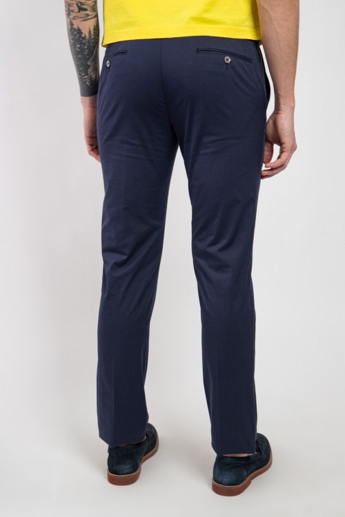 Мужские темно-синие брюки из хлопкового микса от Tombolini (Томболини). Классическая длина, средняя посадка, застежка на молнию и пуговицу, четыре прорезных кармана, петли в поясе для ремня.