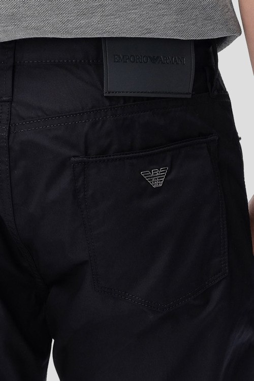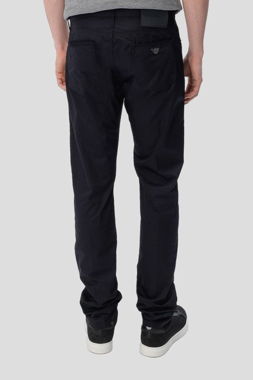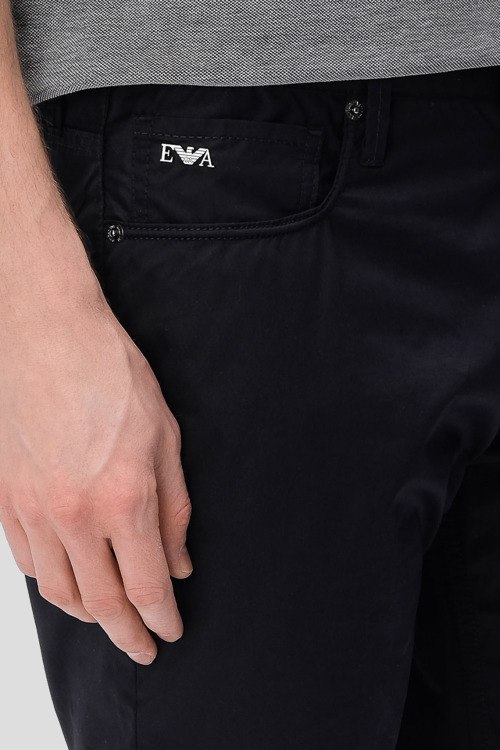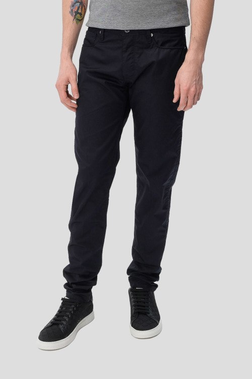 Детали: Мужские темно-синие зауженные брюки от Emporio Armani (Эмпорио Армани). Пяти-карманная модель, пояс с петлями для ремня, нашивка с логотипом сзади на поясе, зауженный крой, полная длина