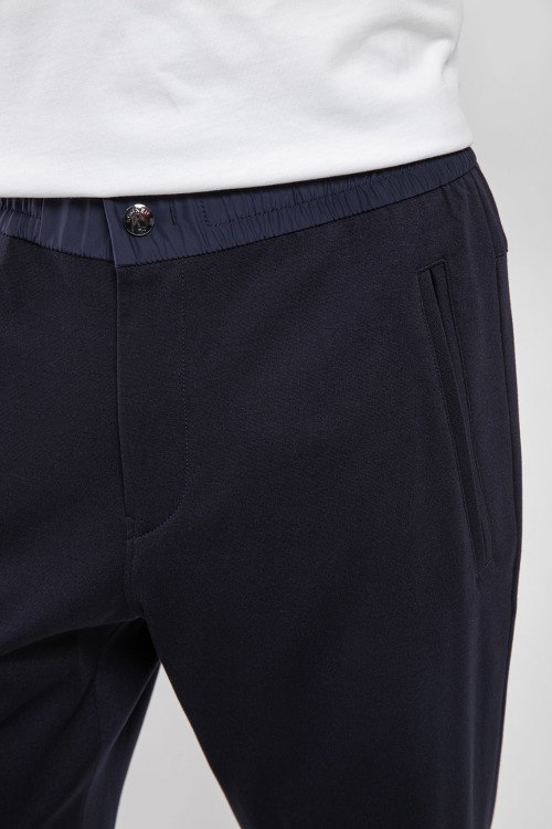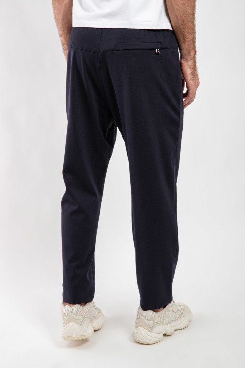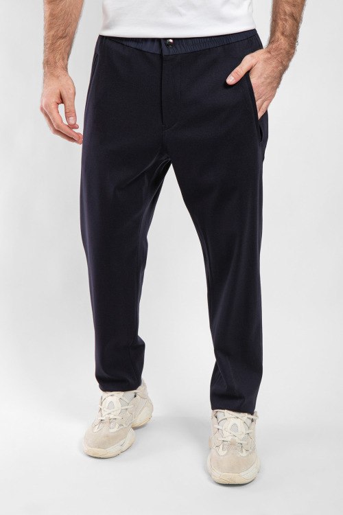 Детали: Мужские темно-синие брюки Richy из вискозного микса от Bogner (Богнер). Классическая длина, высокая посадка, эластичная резинка на поясе с кулиской, застежка на молнию и кнопку, прорезные боковые карманы, задний карман на молнии, металлический логотип бренда