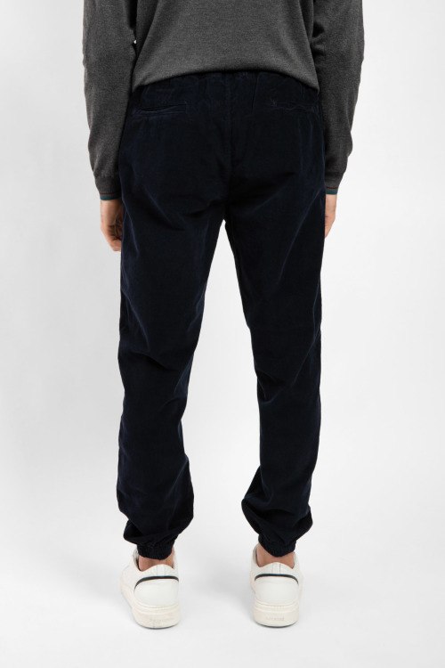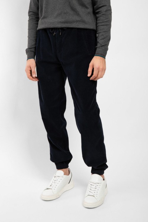 Мужские темно-синие джоггеры из хлопкового микса от Bikkembergs (Биккембергс). Классическая длина, эластичная резинка на манжетах, застежка на молнию и пуговицу, кулиска в поясе, прорезные карманы.
