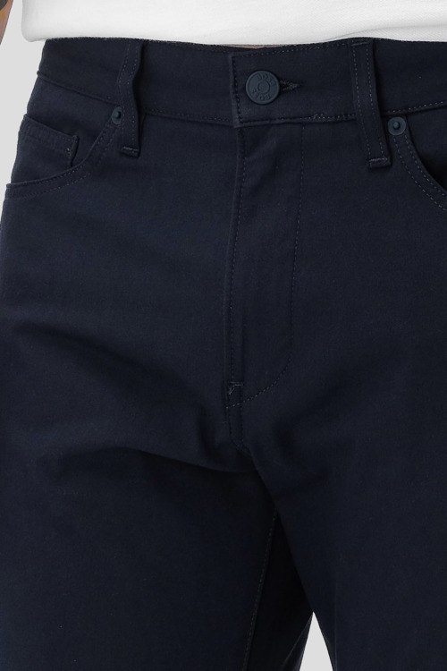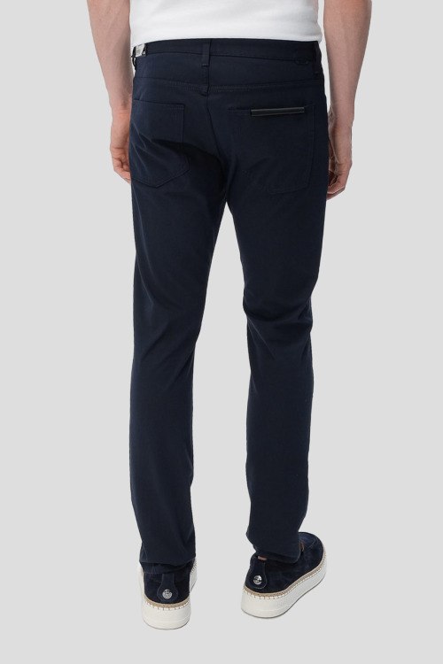 Детали: Мужские темно-синие хлопковые брюки P-Delaware5 от Hugo Boss (Хуго Босс). Пяти-карманная модель, пояс с петлями для ремня, крой Slim Fit, полная длина