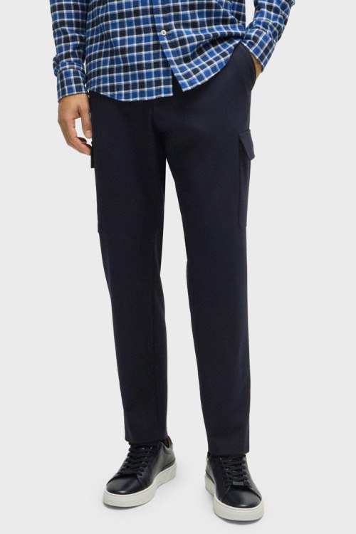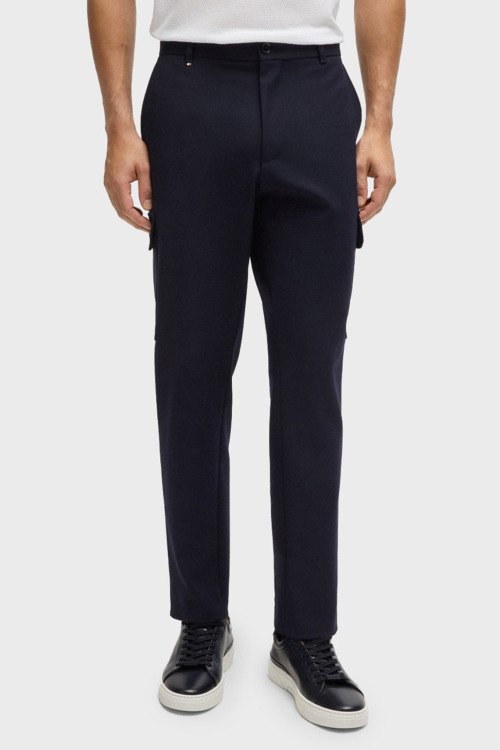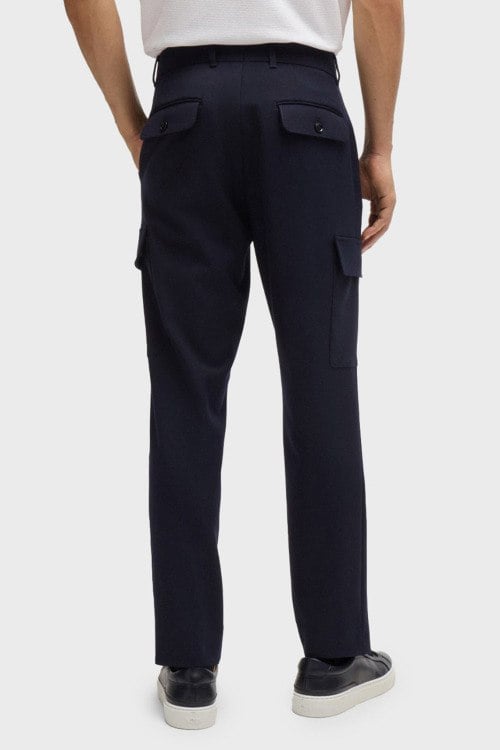 Детали: Мужские темно-синие брюки -карго из шерстяного микса от Hugo Boss (Хуго Босс). Классическая длина, застежка на молнию и пуговицу, прорезные карманы, накладные карманы с клапаном, петли в поясе для ремня