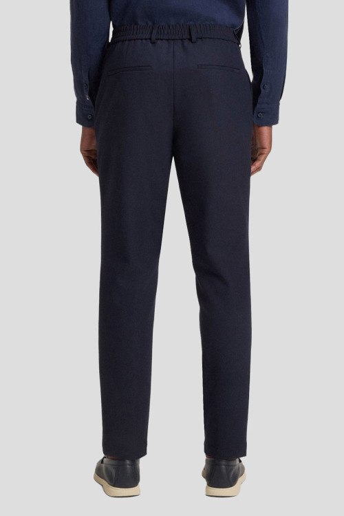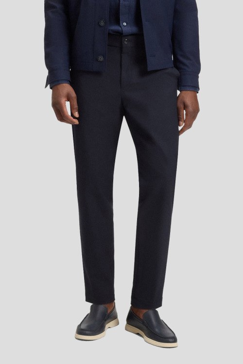 Детали: Мужские темно-синие брюки с примесью шерсти P-Perin от Hugo Boss (Хуго Босс). Боковые и задние карманы, пояс с петлями для ремня и сзади на резинке, прямой крой, полная длина