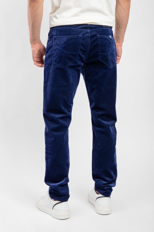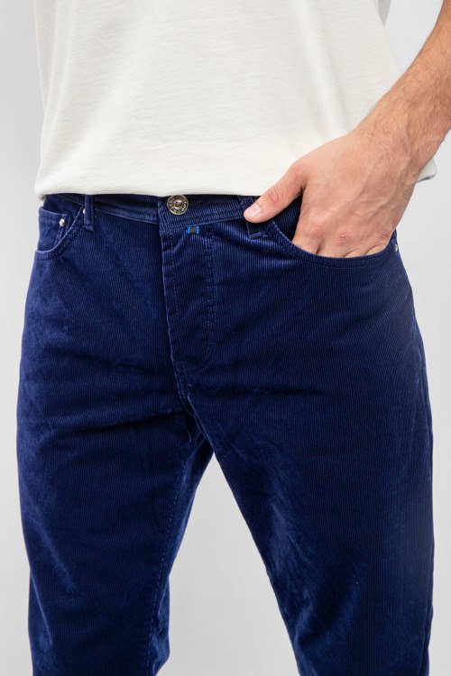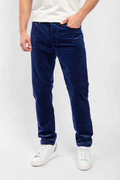 Мужские темно-синие велюровые брюки от Jacob Cohen (Джейкоб Коэн). Пяти-карманная модель, пояс с петлями для ремня, нашивка с логотипом на заднем кармане, зауженный крой, полная длина.