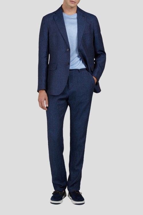 Детали: Мужские темно-синие брюки из льна от Paul & Shark (Пол энд Шарк). Классическая длина, застежка на молнию и пуговицу, четыре кармана, петли в поясе для ремня