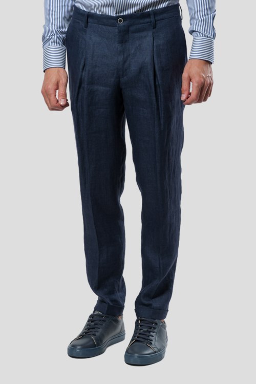 Детали: Мужские темно-синие брюки из льна от Sand (Санд). Классическая длина, застежка на молнию и пуговицу, четыре кармана, петли в поясе для ремня