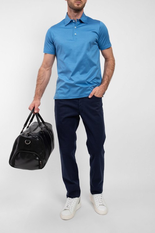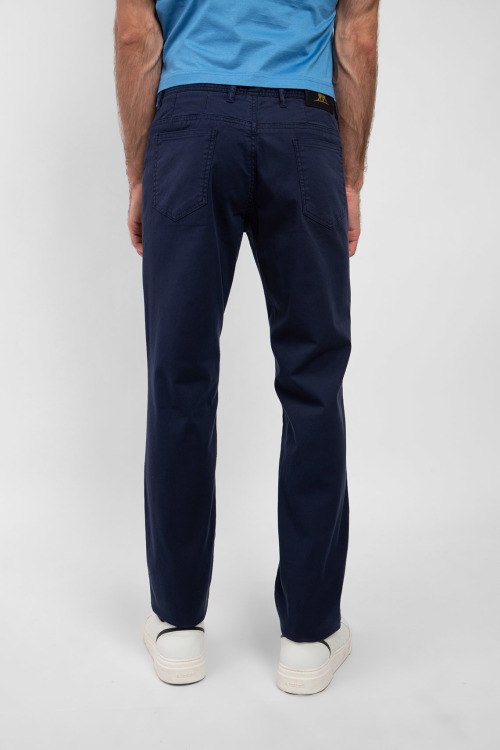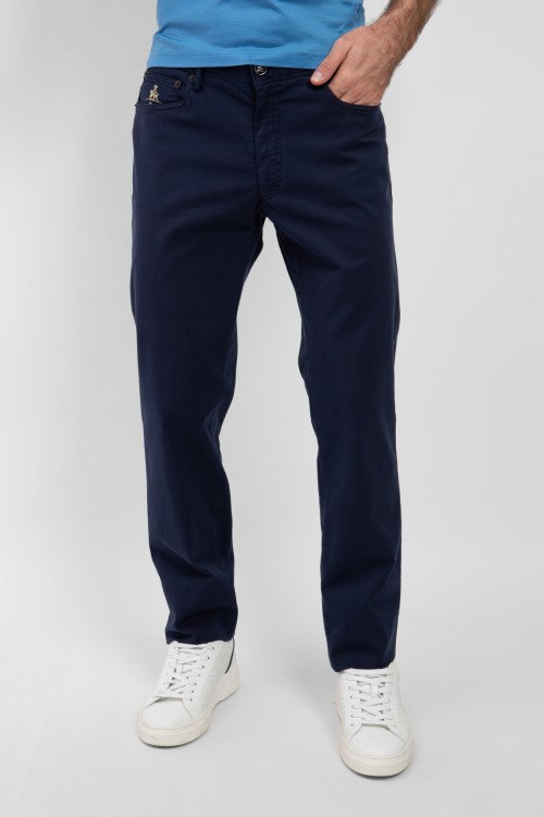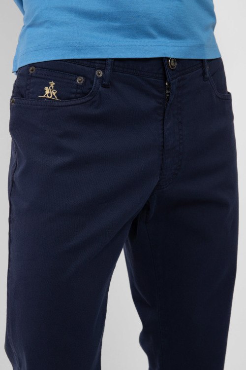 Мужские темно-синие брюки из хлопкового микса от Scabal (Скабал).Классическая длина, застежка на молнию и пуговицу, пять карманов, петли в поясе для ремня, вышитый логотип бренда.